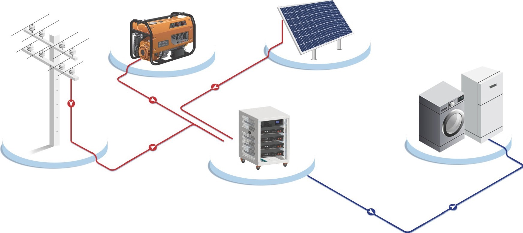 La scatola del sistema contiene tutti i dispositivi che costituiscono la parte di conversione (inverter off-grid 5kW), accumulo (accumulatore LiFeSO4 5kW/h), protezioni CC e CA dell'impianto fotovoltaico, By-Pass manuale per alimentazione diretta dalla rete in caso di guasto interno.